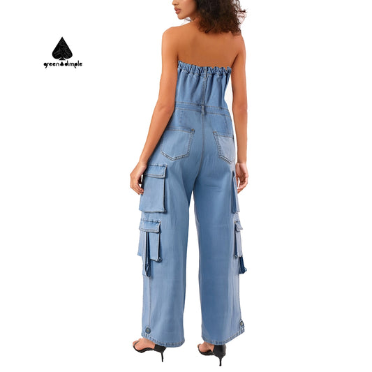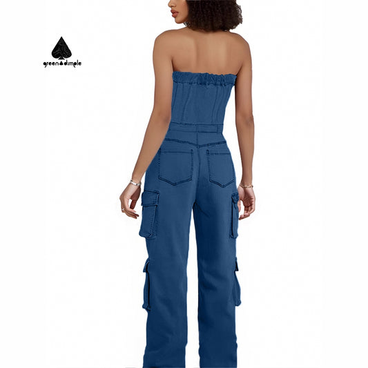 Plus size Strapless Multi Pockets Women Denim Jumpsuit