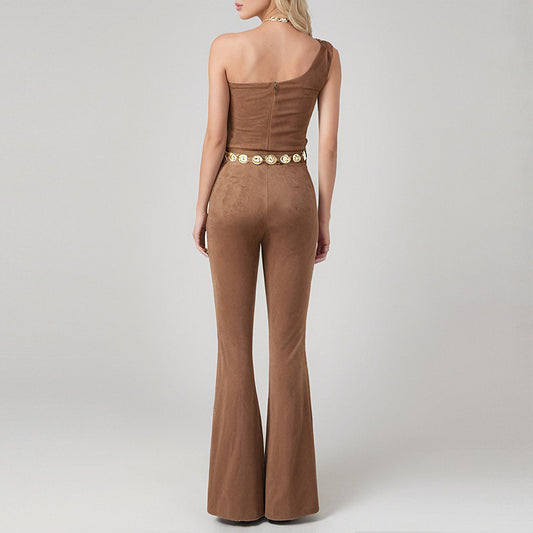 Suede rhinestone waistband one shoulder women fashion jumpsuit
