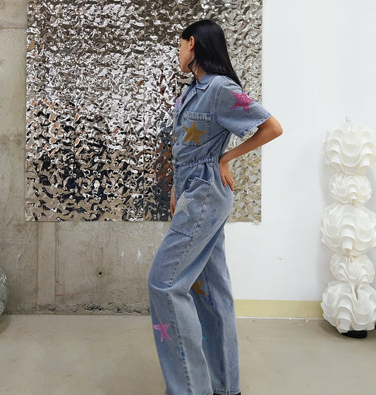 Streewear fashion denim crystal embroideried short sleeve front open jumpsuit