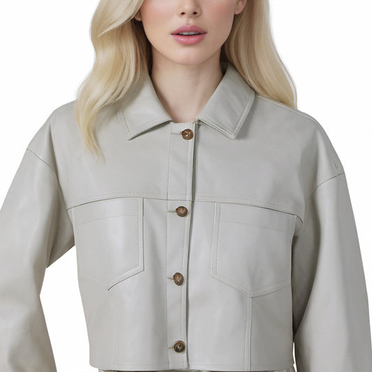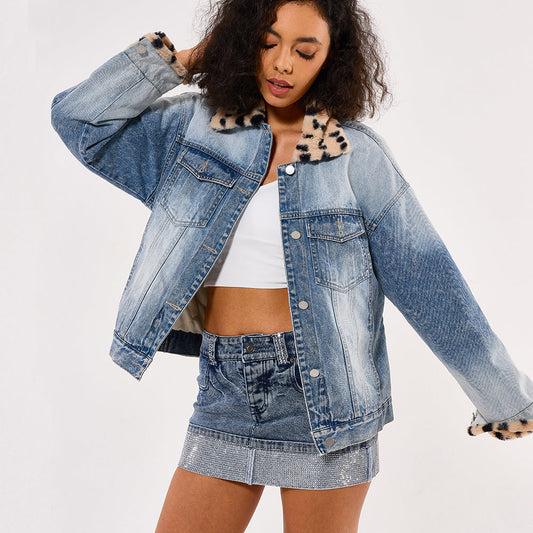 Original factory Women's leopard print fur collar front open denim slim fit top jacket coast