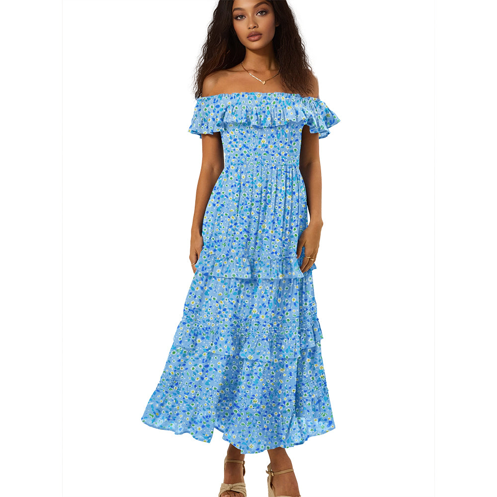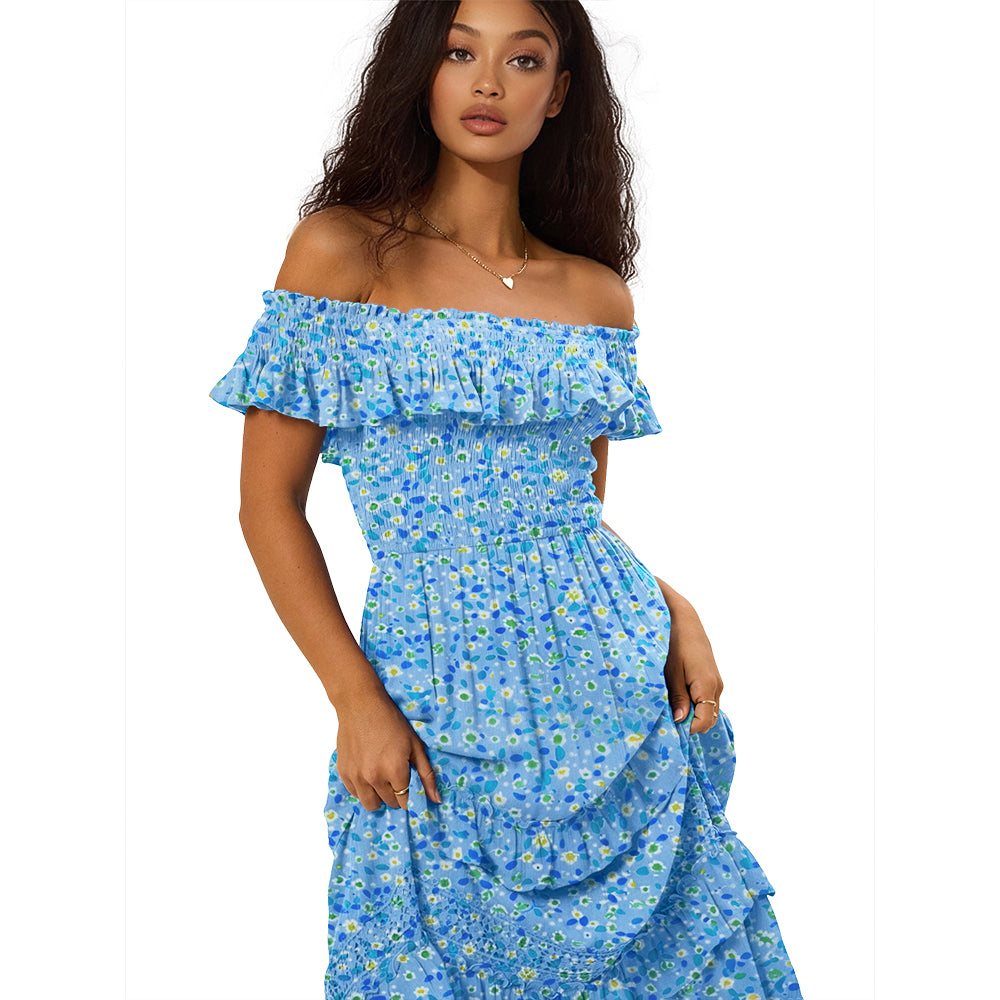 Get ready to turn heads in this stunning pattern blue Summer Casual floral dress! The off shoulder design and elastic waistband provide a comfortable yet elegant fit, perfect for any occasion. Made with a beautiful small floral print, this dress exudes femininity and style. Don't miss out on this must-have addition to your wardrobe!