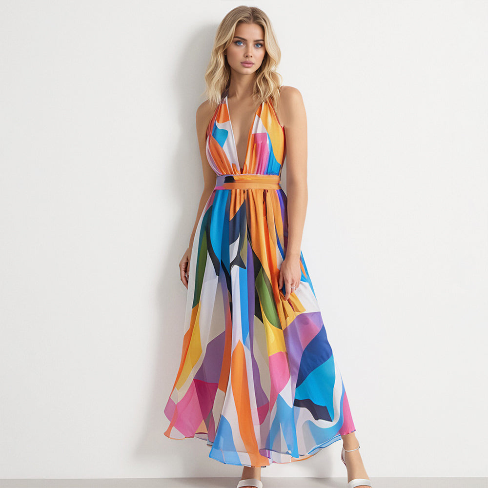 Unleash your inner goddess in our Colorblock Wrap Hem Belted Backless Sexy Halter Dress. Designed to inspire confidence and turn heads, this dress features a trendy design and a stunning wrap hem that will flatter your figure. With a belted back for added allure, this dress is perfect for any special occasion.