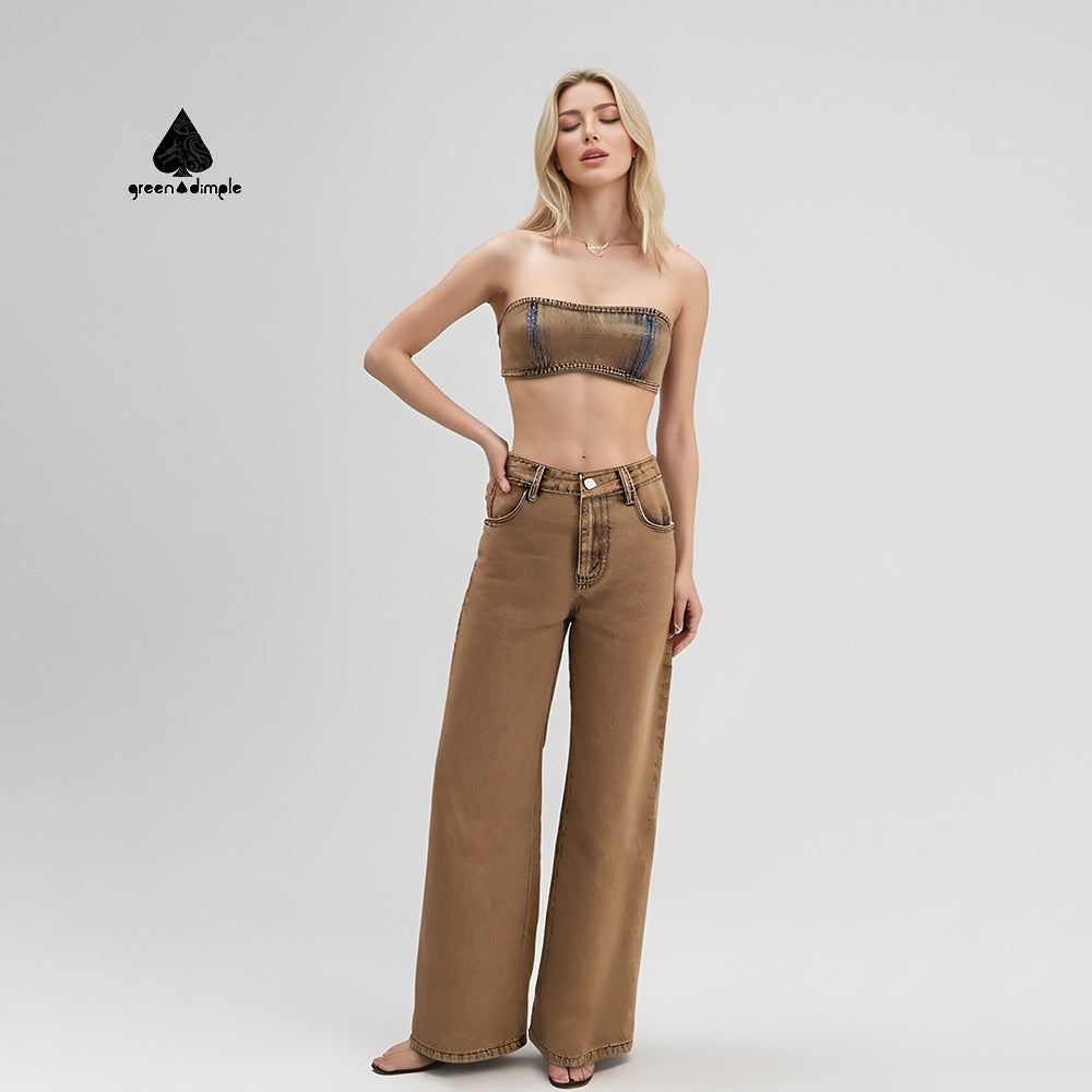 Look sexy and chic in this 2-piece denim set featuring a high-quality washed denim material and a stylish tube top that wraps around the bust. The long jeans pants provide a sleek and flattering fit. Upgrade your wardrobe with this must-have set for a confident and fashionable look!