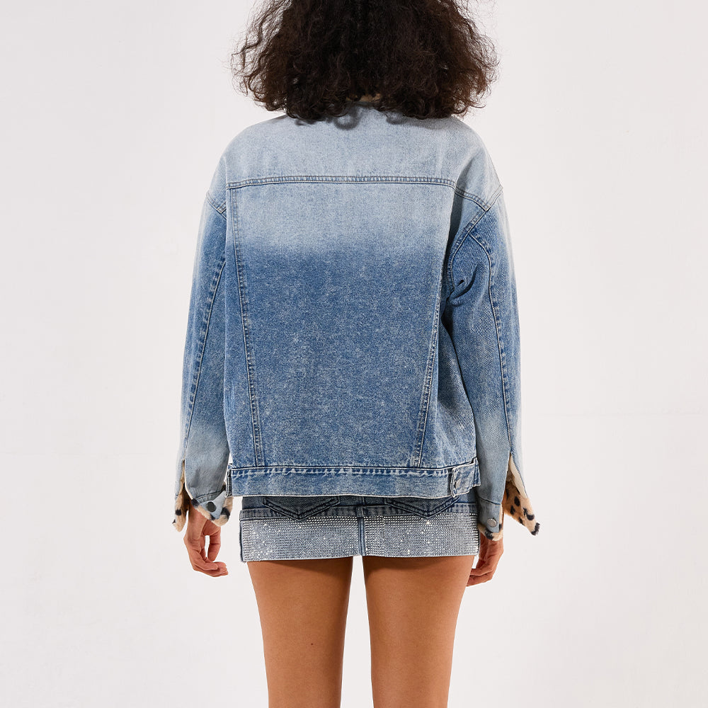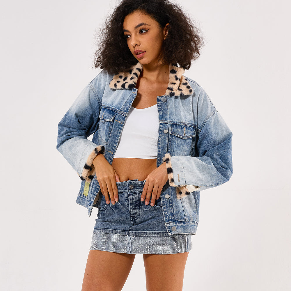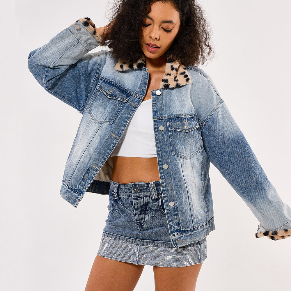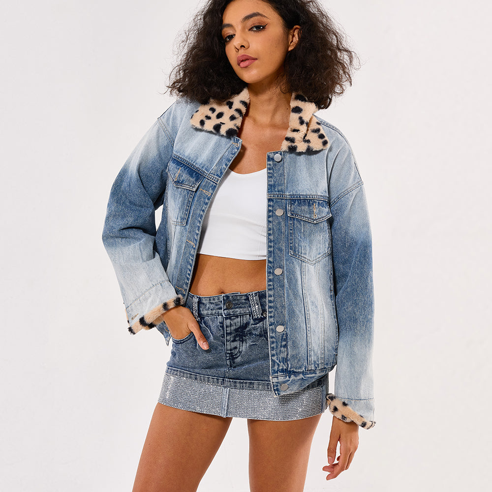 Unleash your wild side with our Original factory leopard print fur collar jacket! Featuring a slim fit and front open design, this denim masterpiece will elevate your style game. Embrace the adventure and take a walk on the wild side with this bold and daring piece. Grab yours now!