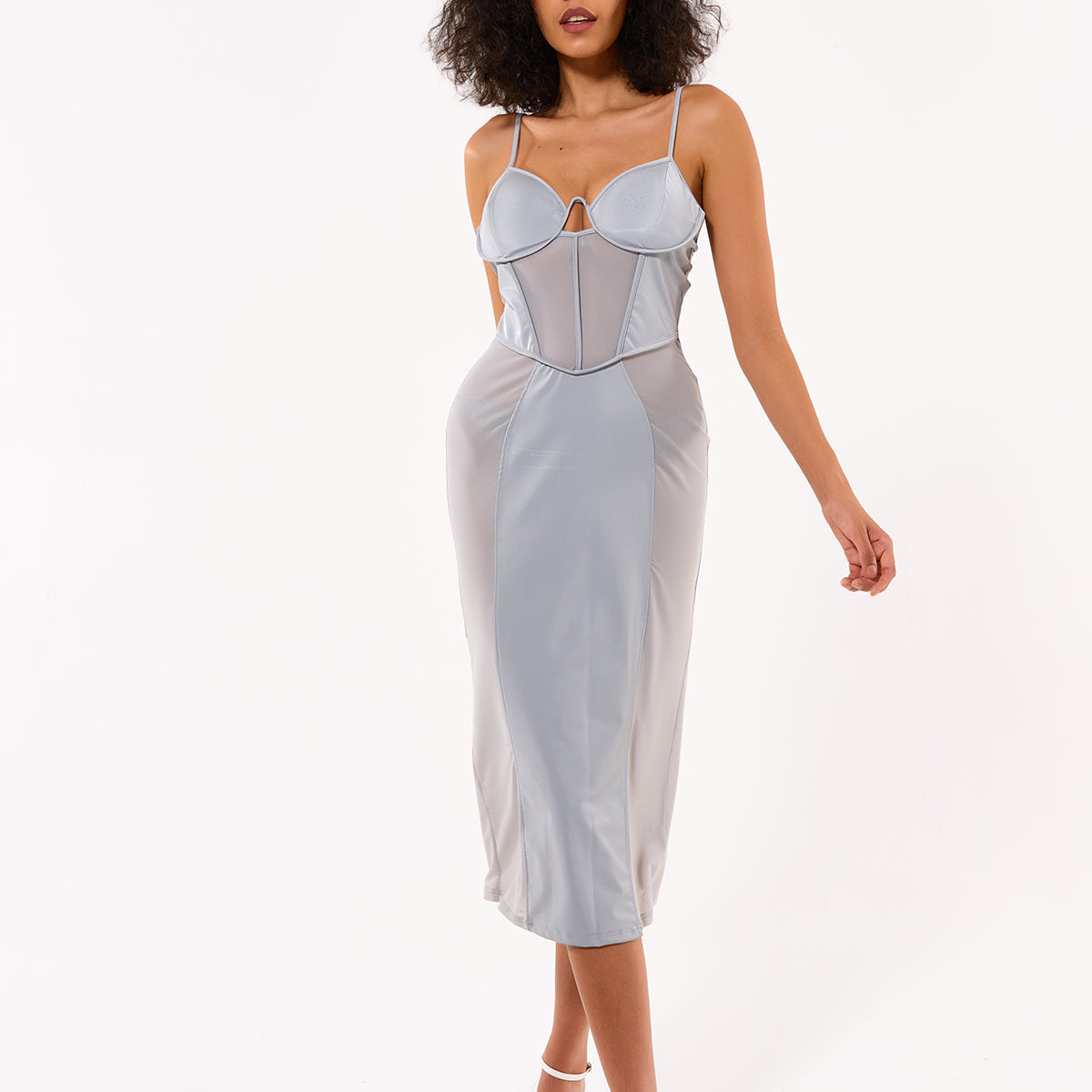 Crafted with a delicate mesh fabric in a soft LightGray hue, this dress exudes sophistication and grace. Its midi length and flattering silhouette make it perfect for any upscale event or special occasion. Elevate your wardrobe with this luxurious piece.