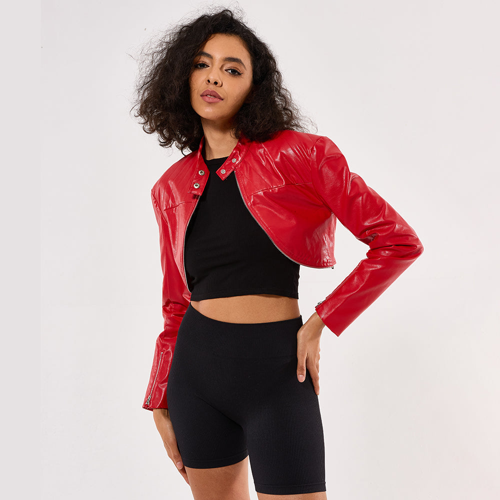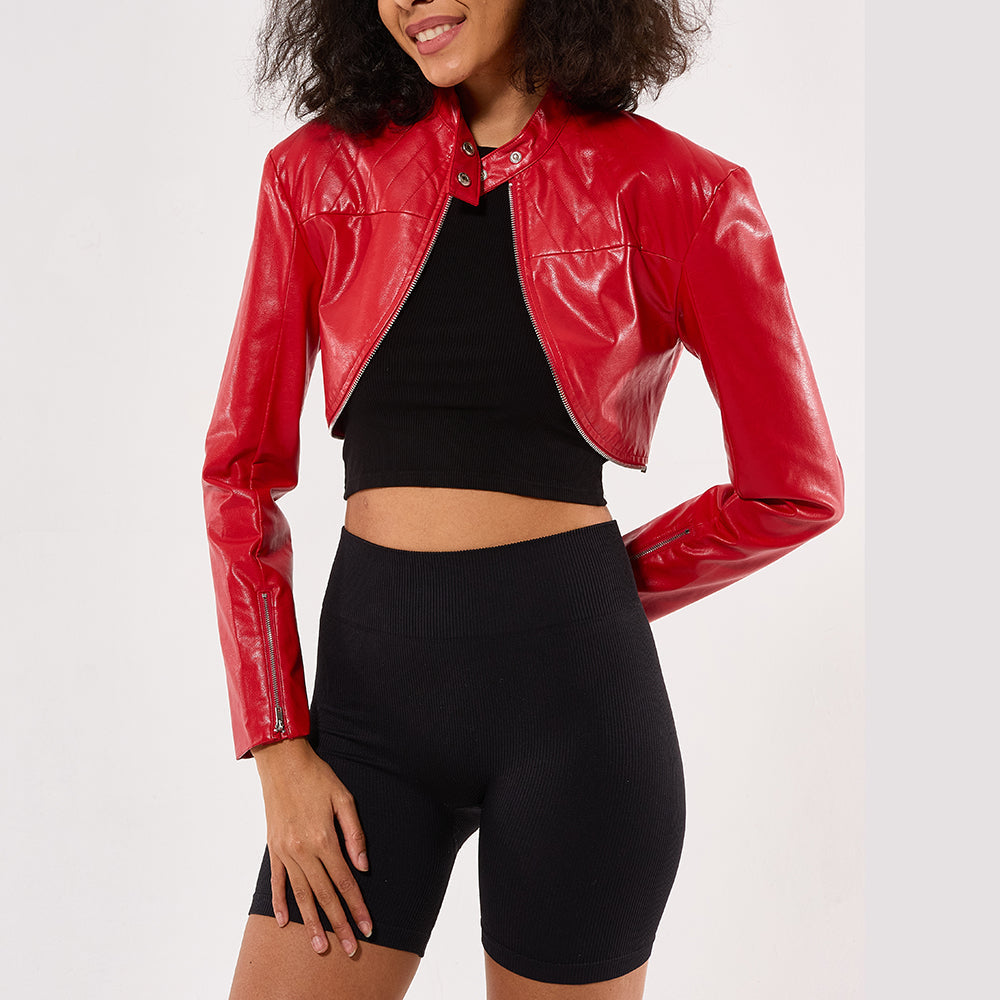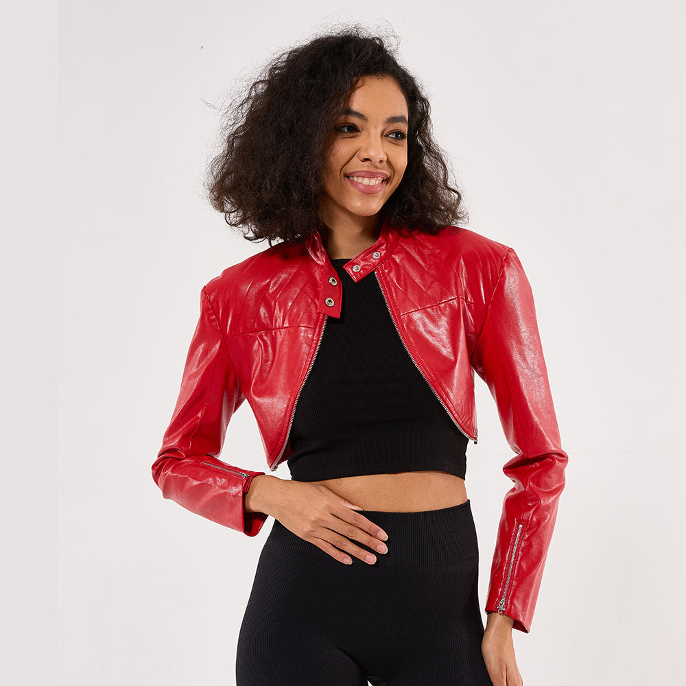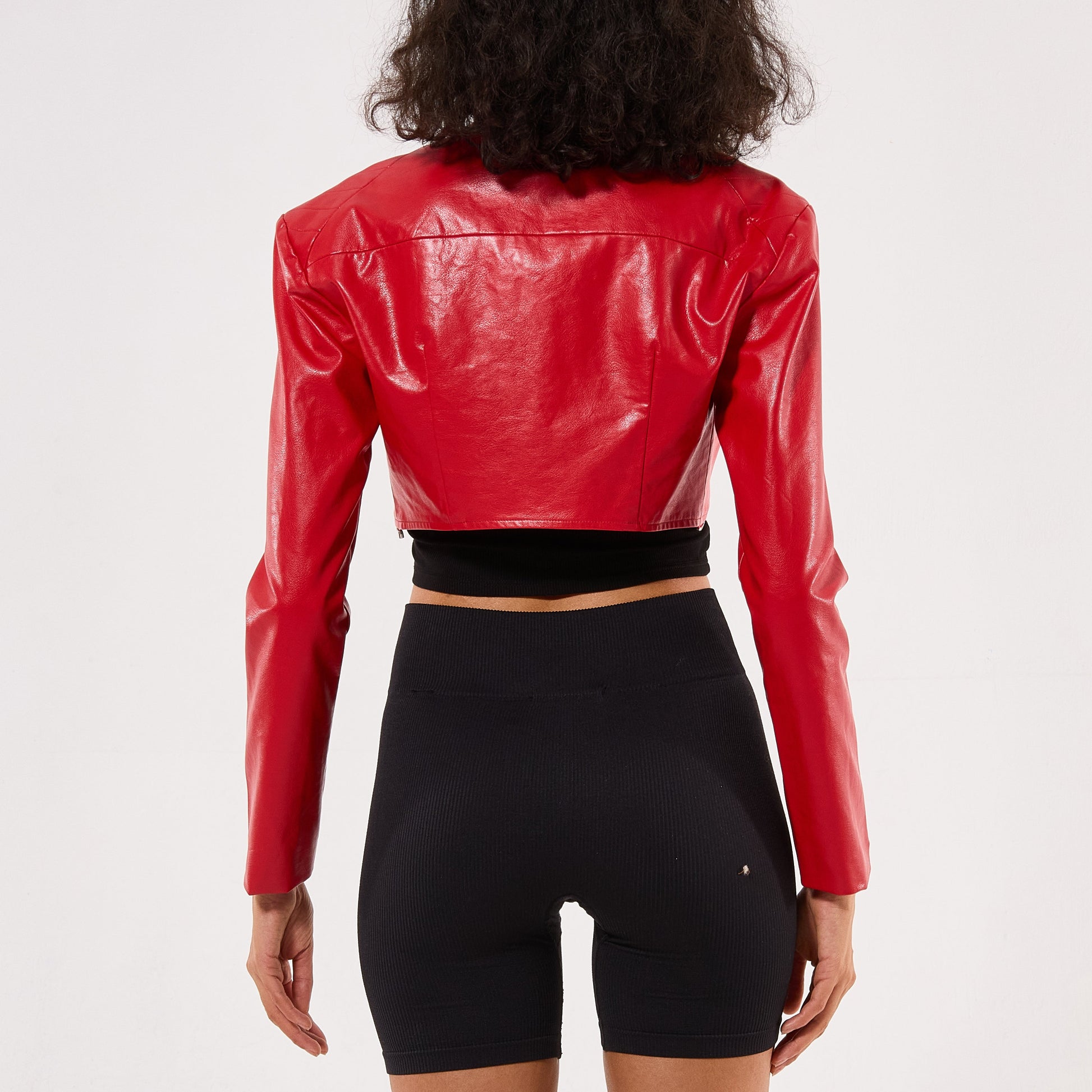 Motor Sport Faux Leather Bomber Jacket in bold red. Made with premium faux leather, this jacket features a versatile bomber style that exudes sophistication. Elevate your style and make a statement with this exclusive piece.