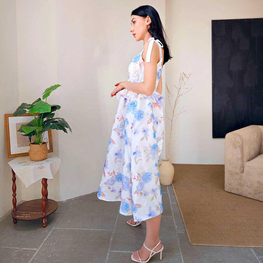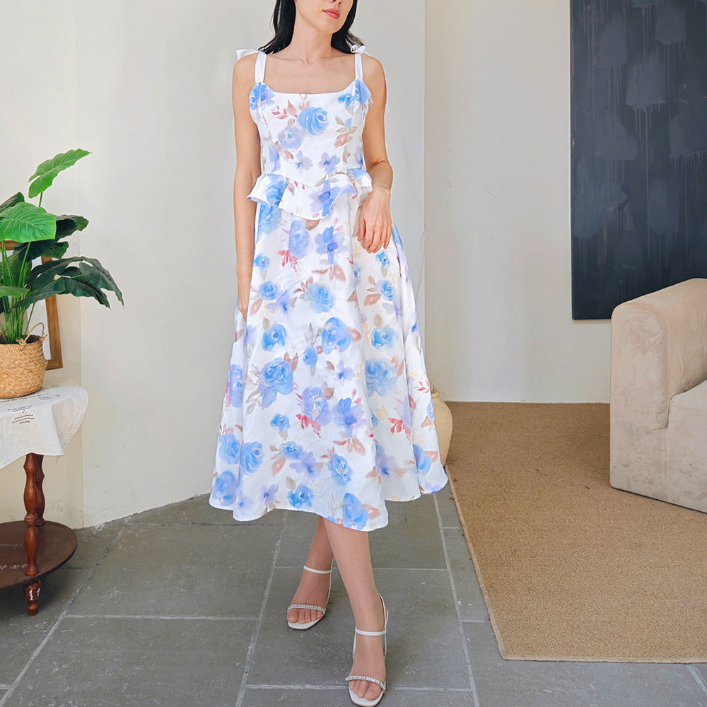 Sunny Evenings Blue Multi Lurex Flutter Sleeve Midi Dress