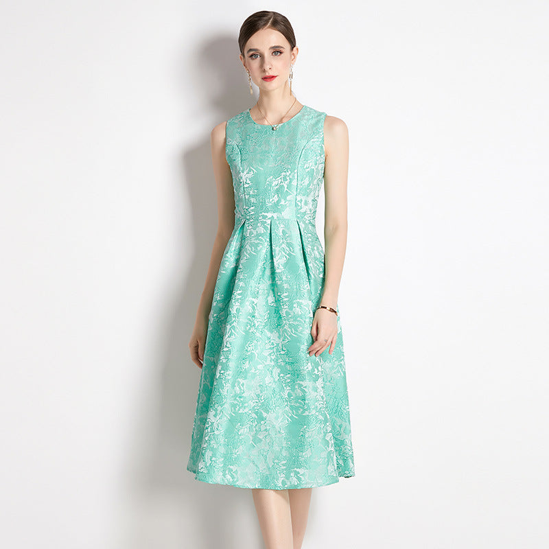 Elevate your wardrobe with this sophisticated brocade midi dress, featuring an exquisite pink and green floral pattern that commands attention. The sleeveless A-line silhouette flatters all figures while the midi length offers versatile styling for any occasion—from casual gatherings to evening events. Crafted with premium brocade fabric, this dress delivers refined elegance with effortless grace. Perfect for those seeking a timeless piece that transitions seamlessly between seasons and settings, combining understated luxury with contemporary design.