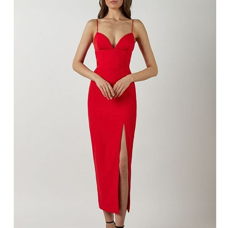 Women's Spaghetti Strap Deep V Neck Bodycon Slit Evening Party Dress